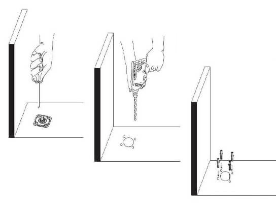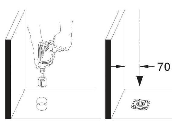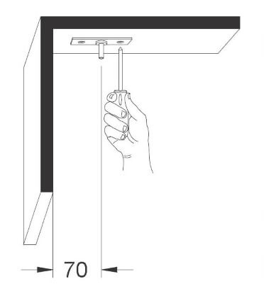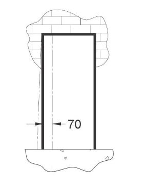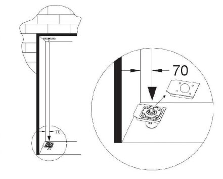 Faça a marcação do pivô superior 201, obedecendo a distância de 70 mm da parede para o eixo do pivô; concluída a marcação, faça a furação aplicando as buchas 56.